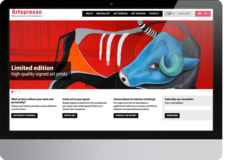 Artspresso is an art showroom & marketplace, offering a fine selection of paintings, prints and photographs from contemporary artitsts. Deseo Studio was responsible for designing and developing the entire platform. We made sure that the artworks attract most of the user attention & browsing is really intuitive.